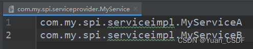 ????????服务提供者提供了接口的具体实现后,需要在资源文件夹中创建META-INF/services文件夹,并且新建一个以全类名为名字的文本文件,文件内容为实现类的全名(如下面图中的红框);