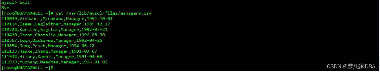 mysql> exit Bye [root@DBAMAXWELL ~]# cat /var/lib/mysql-files/managers.csv 110039,Vishwani,Minakawa,Manager,1991-10-01 110114,Isamu,Legleitner,Manager,1989-12-17 110228,Karsten,Sigstam,Manager,1992-03-21 110420,Oscar,Ghazalie,Manager,1996-08-30 110567,Leon,DasSarma,Manager,1992-04-25 110854,Dung,Pesch,Manager,1994-06-28 111133,Hauke,Zhang,Manager,1991-03-07 111534,Hilary,Kambil,Manager,1991-04-08 111939,Yuchang,Weedman,Manager,1996-01-03