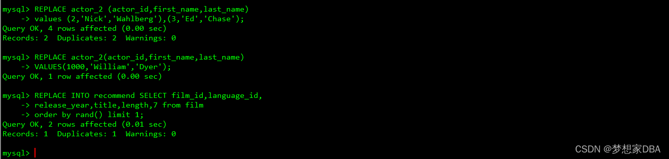 mysql> REPLACE actor_2 (actor_id,first_name,last_name) ? ? -> VALUES (1, 'Penelope','Guiness'); Query OK, 2 rows affected (0.00 sec)