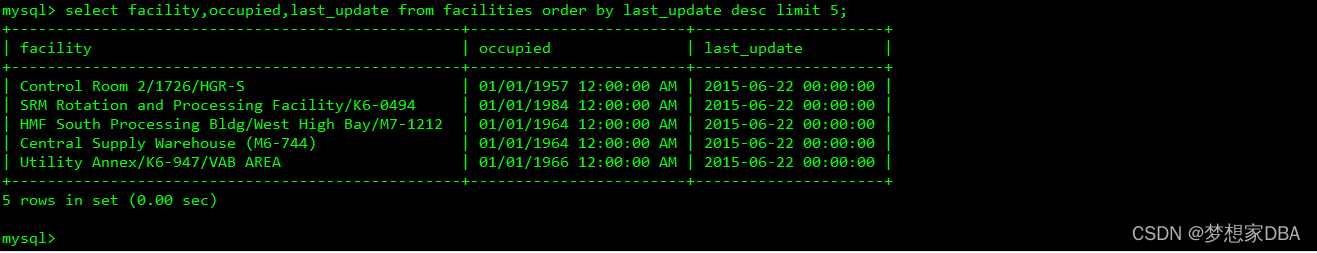 mysql> LOAD DATA INFILE '/var/lib/mysql-files/NASA_Facilities.csv' ? ? -> INTO TABLE facilities FIELDS TERMINATED BY ',' ? ? -> OPTIONALLY ENCLOSED BY '"' ? ? -> IGNORE 1 LINES ? ? -> (center,center_search_status,facility,facility_url, ? ? -> occupied,status,url_link,@var_record_date,@var_last_update, ? ? -> country,contact,phone,location,city,state,zipcode) ? ? -> SET record_date = IF( ? ? -> CHAR_LENGTH(@var_record_date)=0,NULL, ? ? -> ? STR_TO_DATE(@var_record_date,'%m/%d/%Y %h:%i:%s %p') ? ? -> ), ? ? -> last_update = IF( ? ? -> ? CHAR_LENGTH(@var_last_update)=0,NULL, ? ? -> ? ? STR_TO_DATE(@var_last_update,'%m/%d/%Y %h:%i:%s %p') ? ? ? ? -> ); Query OK, 485 rows affected (0.02 sec) Records: 485 ?Deleted: 0 ?Skipped: 0 ?Warnings: 0