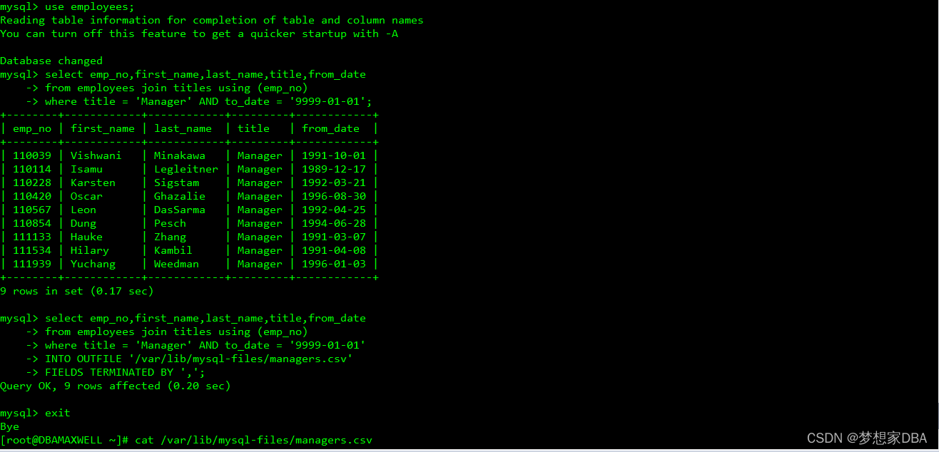 mysql> select emp_no,first_name,last_name,title,from_date ? ? -> from employees join titles using (emp_no) ? ? -> where title = 'Manager' AND to_date = '9999-01-01' ? ? -> INTO OUTFILE '/var/lib/mysql-files/managers.csv' ? ? ? ? ? ? ? ?? ? ? -> FIELDS TERMINATED BY ','; Query OK, 9 rows affected (0.20 sec)