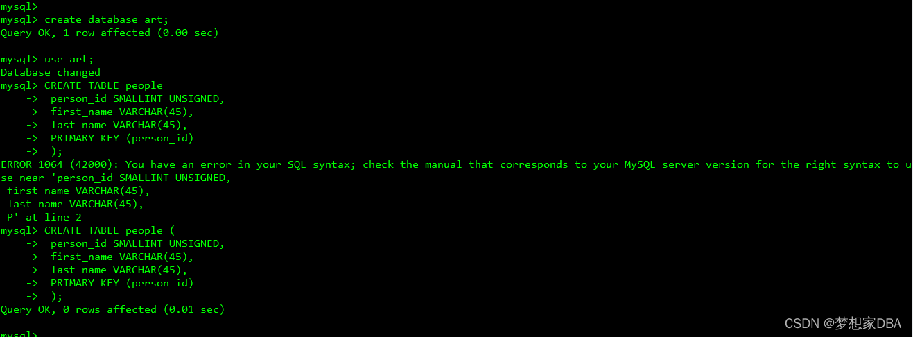 mysql>? mysql> create table actor_3 ( ? ? -> actor_id smallint unsigned not null auto_increment, ? ? -> first_name varchar(45) not null, ? ? -> last_name varchar(45) not null, ? ? -> last_update timestamp not null ? ? -> default current_timestamp on update current_timestamp, ? ? -> primary key (actor_id), ? ? -> key idx_actor_last_name (last_name) ? ? -> ) select * from actor; Query OK, 402 rows affected (0.02 sec) Records: 402 ?Duplicates: 0 ?Warnings: 0