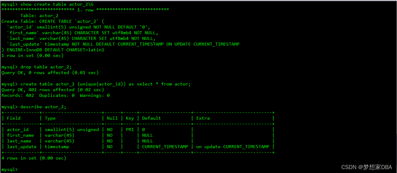 mysql> create table actor_2 as select * from actor; Query OK, 402 rows affected (0.02 sec) Records: 402 ?Duplicates: 0 ?Warnings: 0