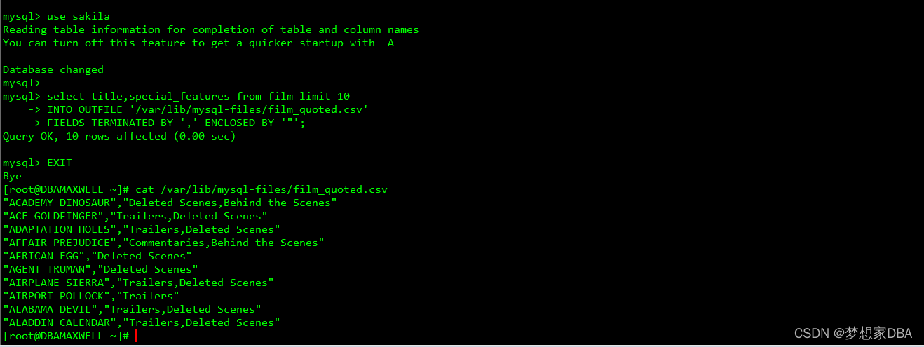 mysql> EXIT Bye [root@DBAMAXWELL ~]# cat /var/lib/mysql-files/film_quoted.csv "ACADEMY DINOSAUR","Deleted Scenes,Behind the Scenes" "ACE GOLDFINGER","Trailers,Deleted Scenes" "ADAPTATION HOLES","Trailers,Deleted Scenes" "AFFAIR PREJUDICE","Commentaries,Behind the Scenes" "AFRICAN EGG","Deleted Scenes" "AGENT TRUMAN","Deleted Scenes" "AIRPLANE SIERRA","Trailers,Deleted Scenes" "AIRPORT POLLOCK","Trailers" "ALABAMA DEVIL","Trailers,Deleted Scenes" "ALADDIN CALENDAR","Trailers,Deleted Scenes" [root@DBAMAXWELL ~]#?