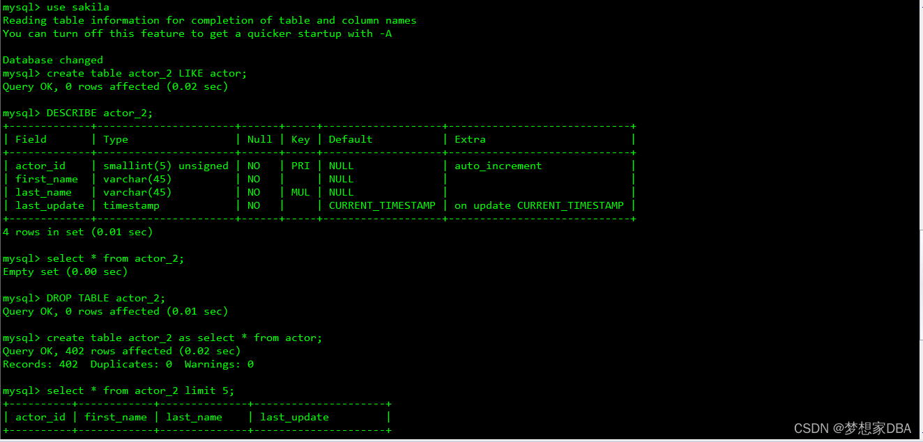 Database changed mysql> create table actor_2 LIKE actor; Query OK, 0 rows affected (0.02 sec)