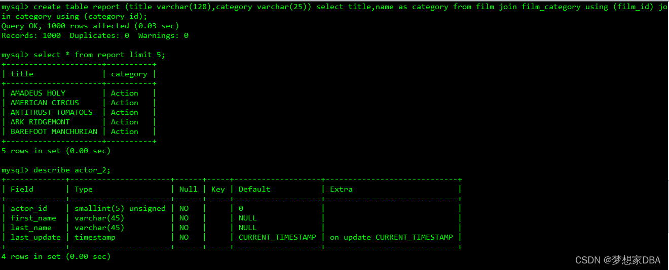 mysql> create table report (title varchar(128),category varchar(25)) select title,name as category from film join film_category using (film_id) join category using (category_id); Query OK, 1000 rows affected (0.03 sec) Records: 1000 ?Duplicates: 0 ?Warnings: 0