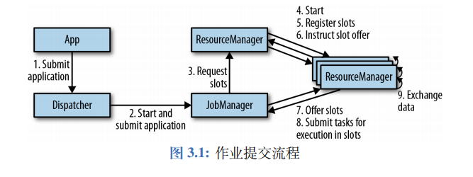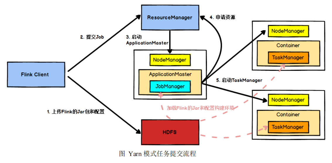 要提交应用,首先提交给分发器Dispatcher,分发器启动一个JobManager然后直接把应用转接给它,JobManager知道需要多少slots,于是向资源管理器ResourceManager发起请求,请求slots,资源管理器收到请求后,去启动TaskManager(如果没有资源管理平台,TaskManager是本来就启动的;有资源管理平台时,要用资源采取启动TaskManager),TaskManager向资源管理器注册自己可用的slot,TaskManager找到能够提供所需slot的TaskManager,发起提供slot的指令。收到指令的TaskManager向JobManager提供slots,JobManager提交要在slots中执行的任务。 上面是从一个较为高层级的视角,来看应用中各组件的交互协作。如果部署的集群环境不同,例如(YARN,Mesos,Kubernetes,standalone等),其中一些步骤可以被省略,或是有些组件会运行在同一个JVM进程中,例如下面将Flink集群部署到YARN上,那么就会有如下的提交流程:  Flink提交任务后,Client向HDFS上传Flink的Jar包和配置,之后向Yarn的ResourceManager提交任务,ResourceManager分配Container资源并通知对应的NodeManager启动ApplicationMaster,ApplicationMaster启动后加载Flink的Jar包和配置构建环境,然后启动JobManager,之后ApplicationMaster向ResourceManager申请资源启动TaskManager,ResourceManager分配Container资源后,由ApplicationMaster通知资源所在节点的NodeManager启动TaskManager,NodeManager加载Flink的Jar包和配置构建环境并启动TaskManager,TaskManager启动后向JobManager发送心跳包,并等待JobManager向其分配任务。