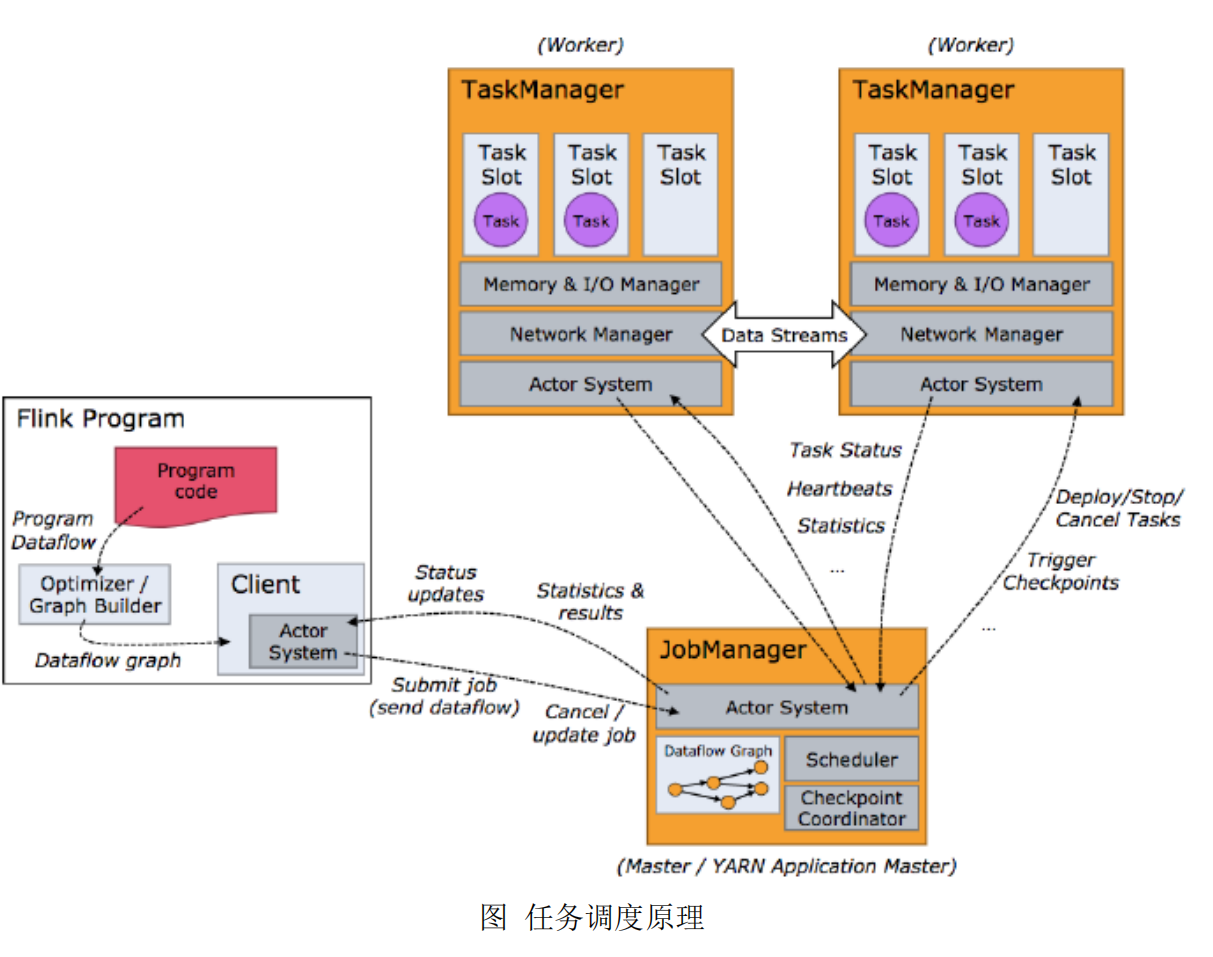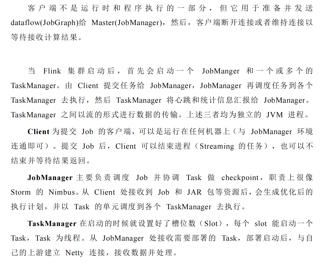 Flink运行时由两种类型的进程组成:一个JobManager和一个或者多个TaskManager,采用了典型的Master-Slave架构,如下图:  作业管理器JobManager只负责调度,不负责运行。 任务管理器TaskMananger负责执行程序。