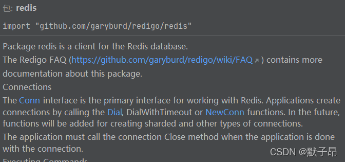 Redigo常见问题解答(https://github.com/garyburd/redigo/wiki/FAQ)包含有关此软件包的更多文档。