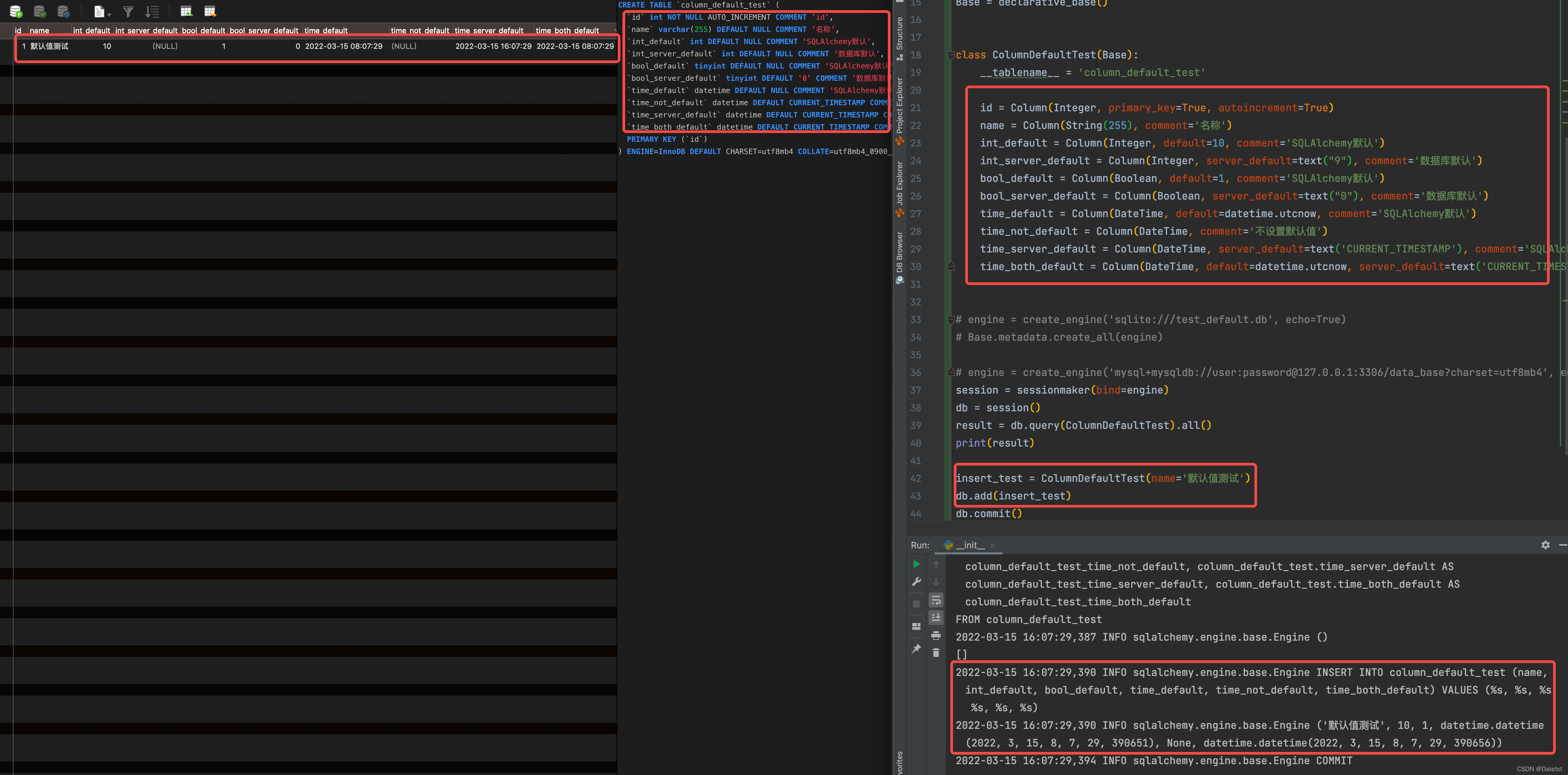 - default走SQLAlchemy的Python程序,打印出SQL语句的话,相当于向数据库表中该字段插入了default设置的默认值;(参考图中所有设置了default值的字段:int_default、bool_default、time_default、time_both_default,最终入库值均为default的设置值,并且在insert的sql语句中均有体现)