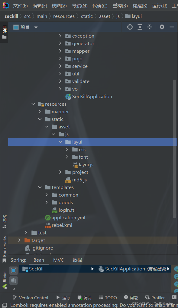 前端:Freemarker、LayUI、jQuery 后端:SpringBoot、MyBatisPlus、Lombok 中间件:RabbitMQ、Redis(redisson) 分布式协调框架:zookeeper