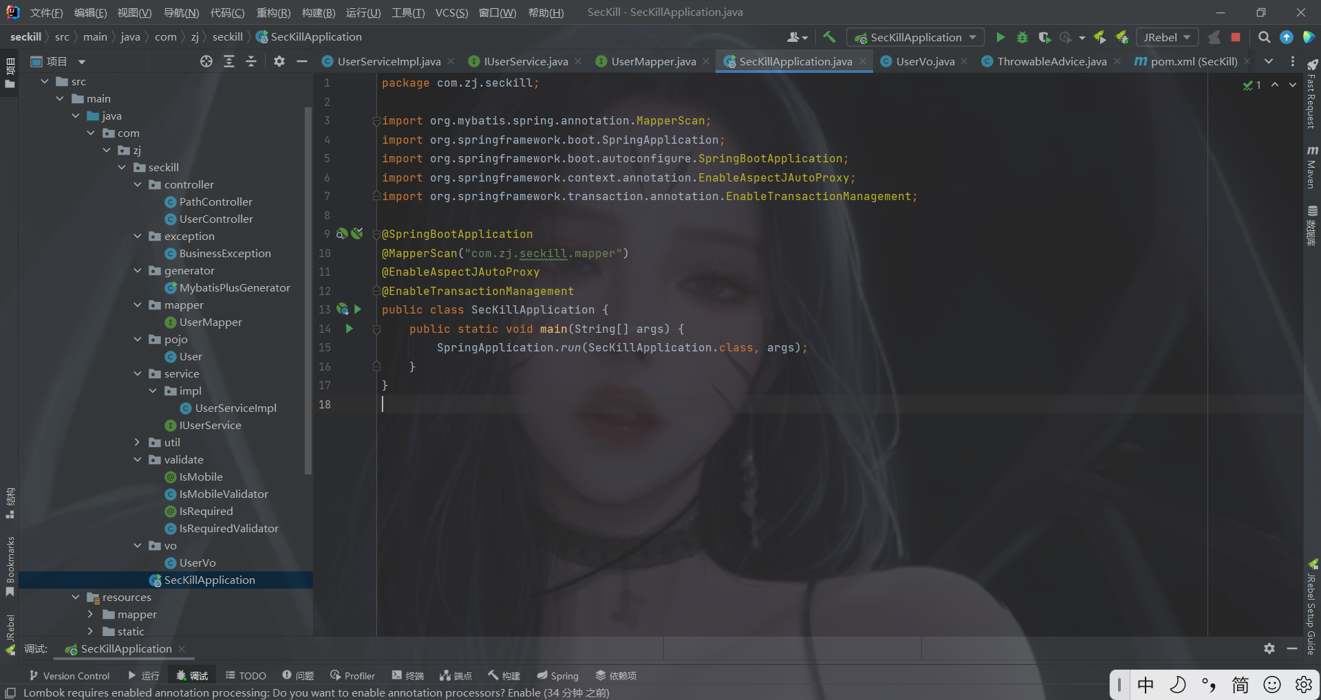 1.安全优化:隐藏秒杀地址、验证码、接口限流 2.服务优化:RabbitMQ消息队列、接口优化、分布式锁 3.页面优化:缓存、静态化分离 4.分布式会话:用户登录、共享session 5.功能开发:商品列表、商品详情、秒杀、订单详情 6.系统压测:JMeter入门、自定义变量、压测