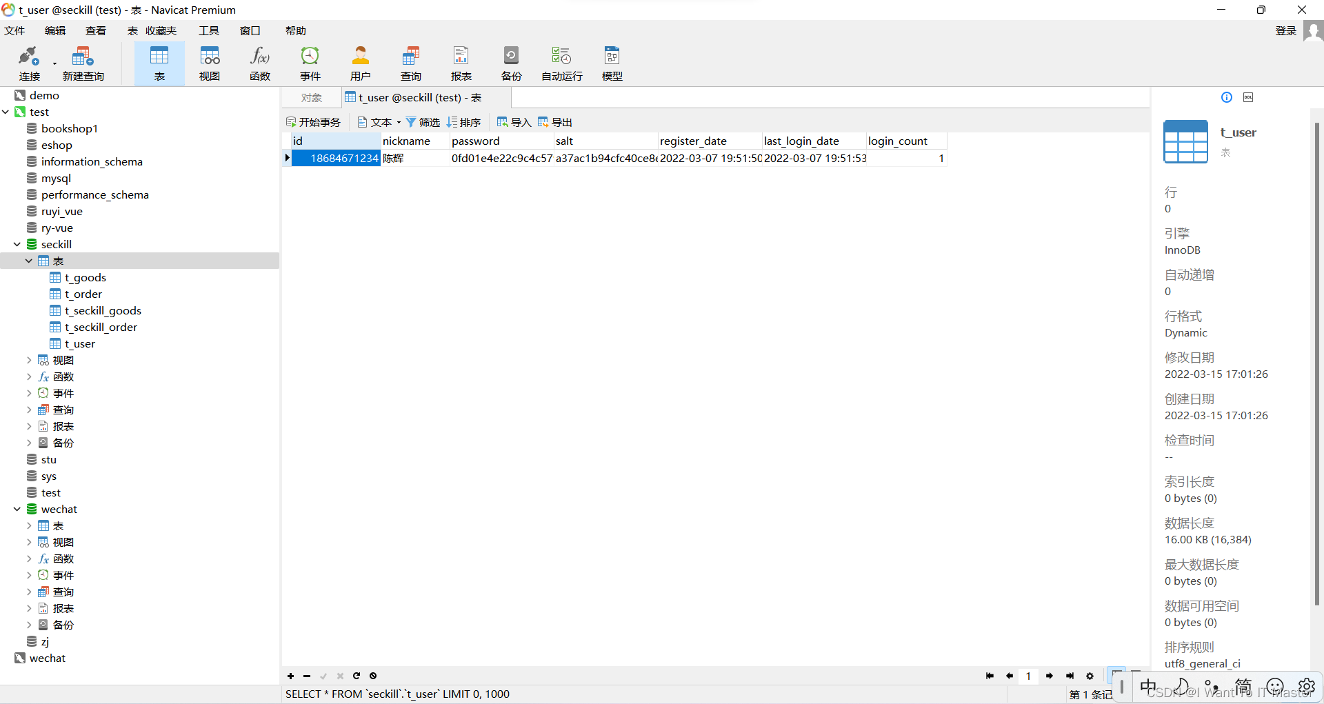 运行sql脚本,构建数据库,其中里面有五张表,用户表、订单表、商品表、秒杀订单表、秒杀商品表