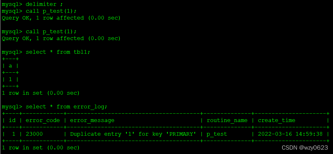 insert into error_log (error_code, error_message, routine_name) values (@o_error_code, @o_error_msg, 'p_test');