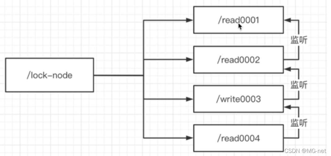 - 如果不是读锁,则上锁失败,为最小节点设置监听。阻塞等待,zk的watch机制会当最小节点发生变化的时候,通知当前节点,在执行第二步
