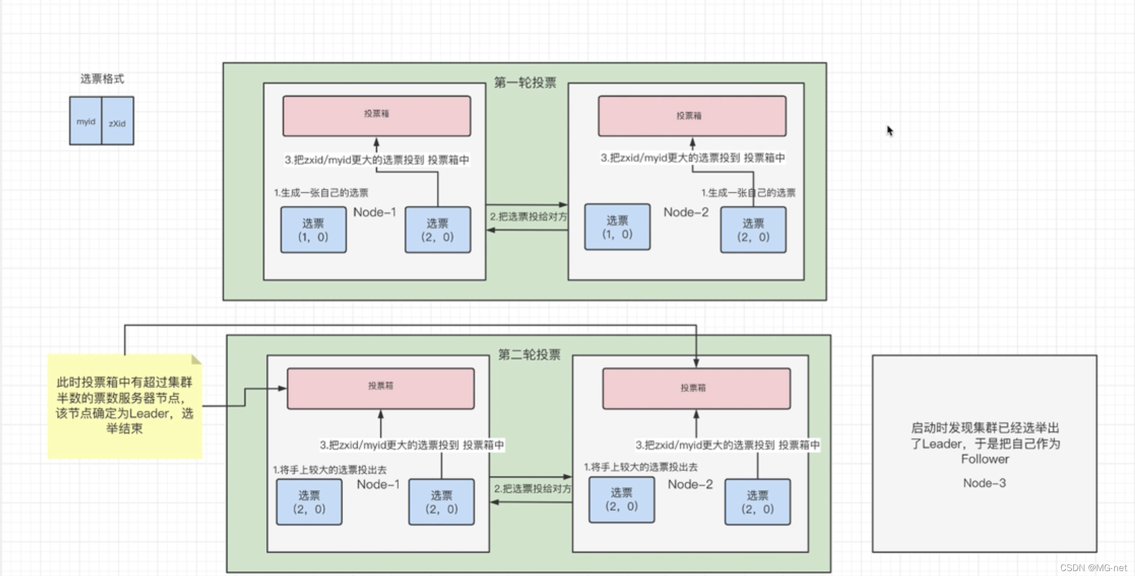 - 因为得票数没有超过集群的一半,第二轮选举,都会投票给上一轮成功的,同时也是node1和node2进行选举?