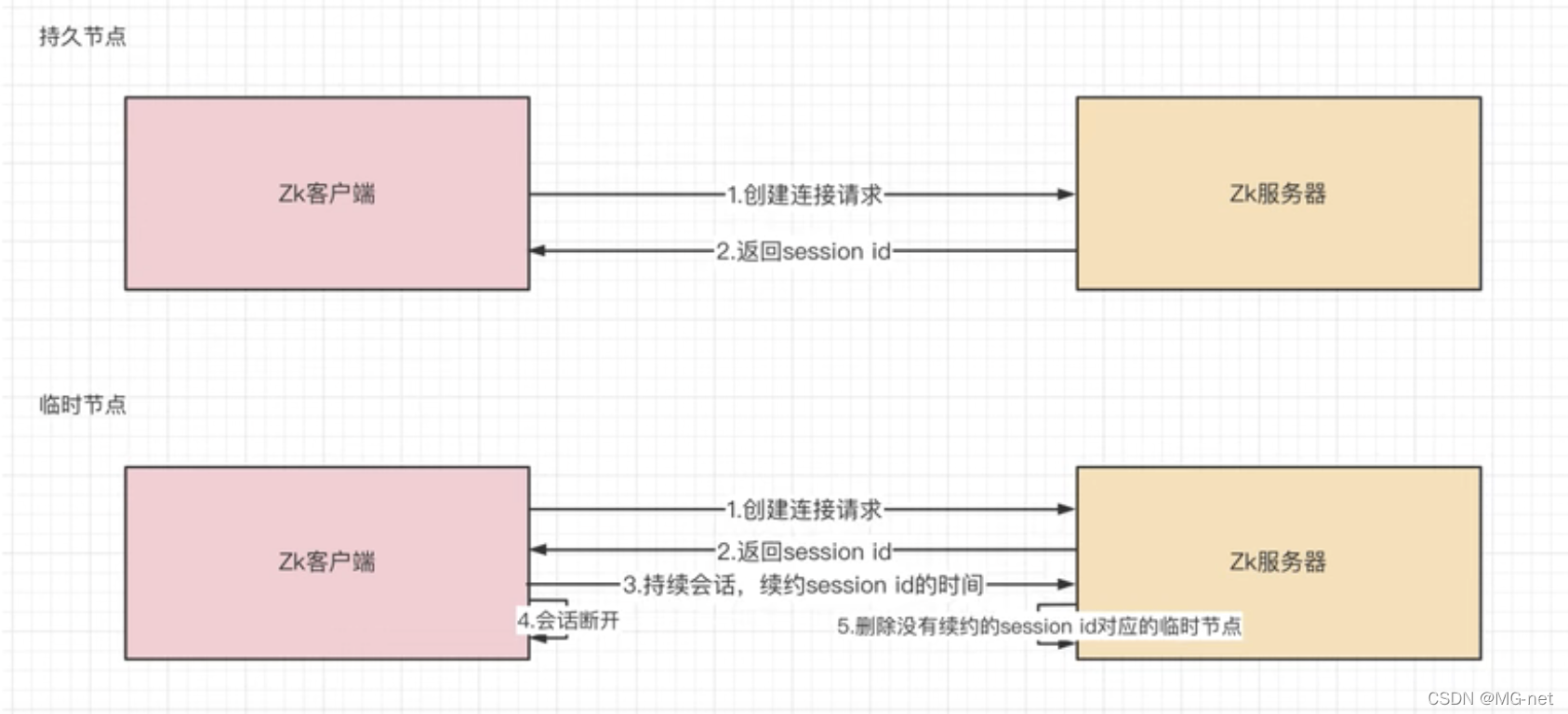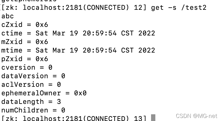 - 临时节点:临时节点是在回话结束后,自动被删除的,通过这个特性,zk可以实现服务发现和注册的效果(create -e /test01)