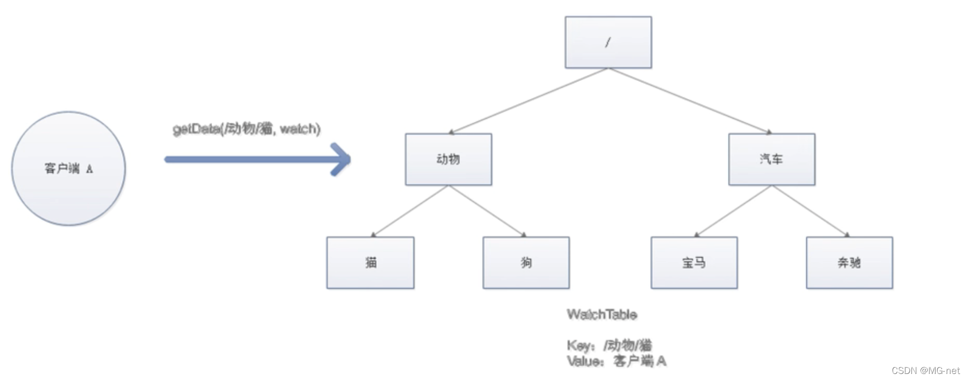 - 客户端调用getData方法,wathc参数是true。服务端接到请求,返回节点数据,并在对应hash表中插入被watch的Znode路径,以及wathc列表