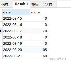 我们如果取近七天的每天总成绩数据,常用的sql应该是: