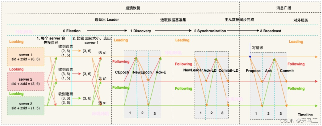 ZAB 协议主要包括两个过程: 消息广播和崩溃恢复。和三个阶段: 分为Discovery 发现,Synchronization 同步,Broadcast 广播。