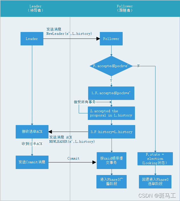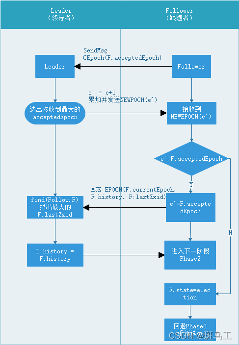 3. Follower 一旦从 Leader 处收到 NewEpoch(e') 消息,会先做判断,如果 e'<F.acceptedEpoch ,并且F.state = election 也就是Looking状态,那么会重新回到Leader选举 阶段。