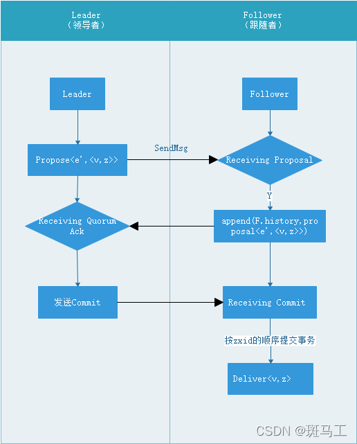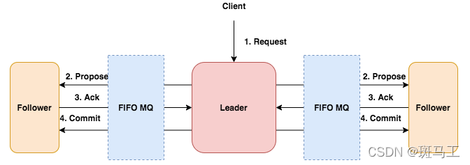 - 然后将 Proposal 发送给所有 Follower (从)。主会为每一个从分配一个单独的队列,以保证消息的有 序性。