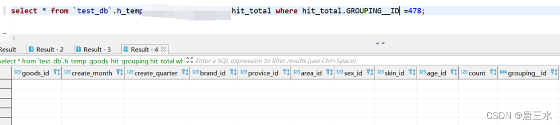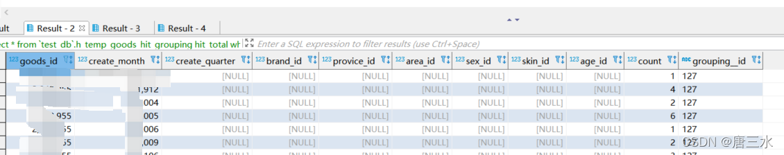 注意: 1、grouping sets 只能用于 group by 之后。 2、grouping sets 中可以包含多种粒度,粒度之间用逗号连接。 3、grouping sets 中的所有字段,都必须出现在 group by 中,相当于 group by 后面的字段是最细粒度。 4、如果 select 中的字段,没有包含在某个 grouping set 中,那么这个粒度下的这个字段值为 NULL。 4、不同的粒度,可以使用内置变量 grouping__id 进行区分。 ?