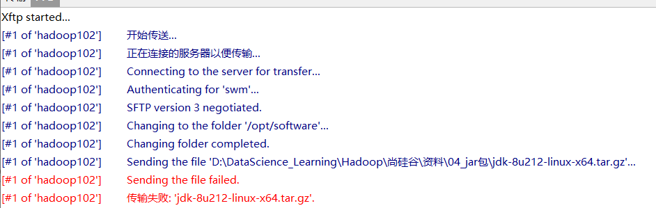 使用Xftp将jkd和hadoop压缩包传送到虚拟机Hadoop102中的"/opt/software"路径下