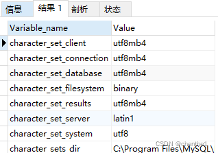 SHOW VARIABLES WHERE Variable_name LIKE 'character%' OR Variable_name LIKE 'collation%';