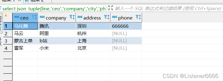 select json_tuple(line,'ceo','company','city','phone') as (ceo,company,address,phone)