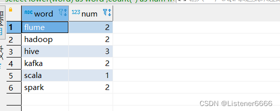 insert into hive_wc values('kafka hadoop spark hive scala');