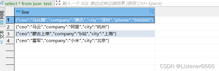 INSERT into json_test values('{"ceo":"马化腾","company":"腾讯","city":"深圳","phone":"666666"}') ;