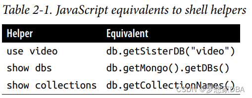 >? > help ? ? ? ? db.help() ? ? ? ? ? ? ? ? ? ?help on db methods ? ? ? ? db.mycoll.help() ? ? ? ? ? ? help on collection methods ? ? ? ? sh.help() ? ? ? ? ? ? ? ? ? ?sharding helpers ? ? ? ? rs.help() ? ? ? ? ? ? ? ? ? ?replica set helpers ? ? ? ? help admin ? ? ? ? ? ? ? ? ? administrative help ? ? ? ? help connect ? ? ? ? ? ? ? ? connecting to a db help ? ? ? ? help keys ? ? ? ? ? ? ? ? ? ?key shortcuts ? ? ? ? help misc ? ? ? ? ? ? ? ? ? ?misc things to know ? ? ? ? help mr ? ? ? ? ? ? ? ? ? ? ?mapreduce