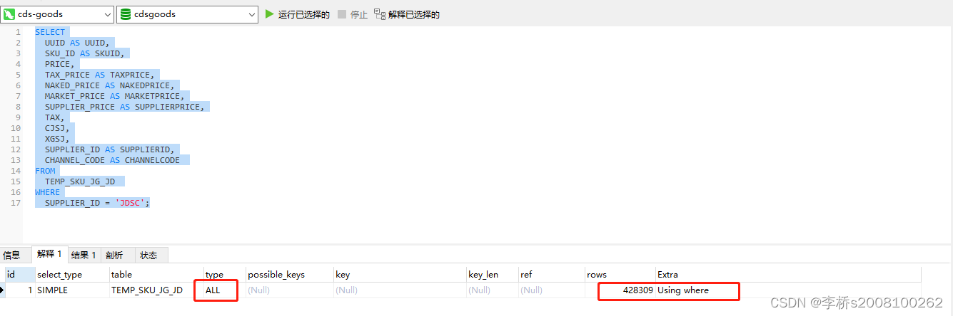 ? ? ?发现一个慢sql,原因是在一张60万的表进行进行查询,查询的结果集预估25万,像这种sql肯定是有问题的,我们一般没有这种需求,单次查询结果集返回超过1000条数据,并返回给客户端,因为这种需求,一般要导致全表扫描,并且磁盘IO压力比较大。 ? ? ?原始sql: