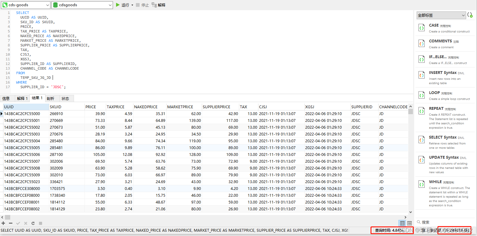 ? ? ?sql执行结果:执行耗时4秒多,返回24万多条数据