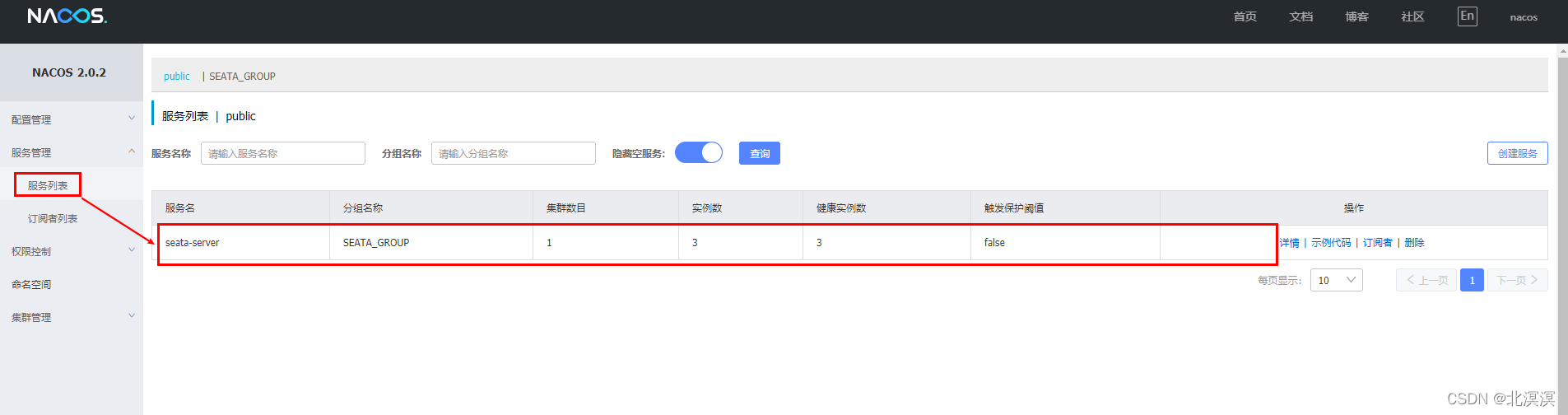 - 在nacos注册中心查看是否有seata服务,有三个健康实例数,说明seata已经安装完成