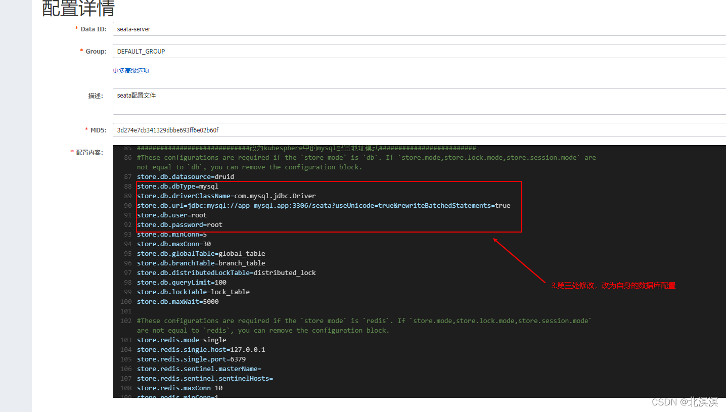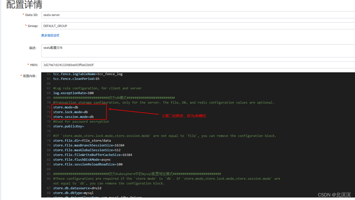 - 需要修改seata的配置文件为数据库模式,修改后如下,标注的地方是需要修改的地方