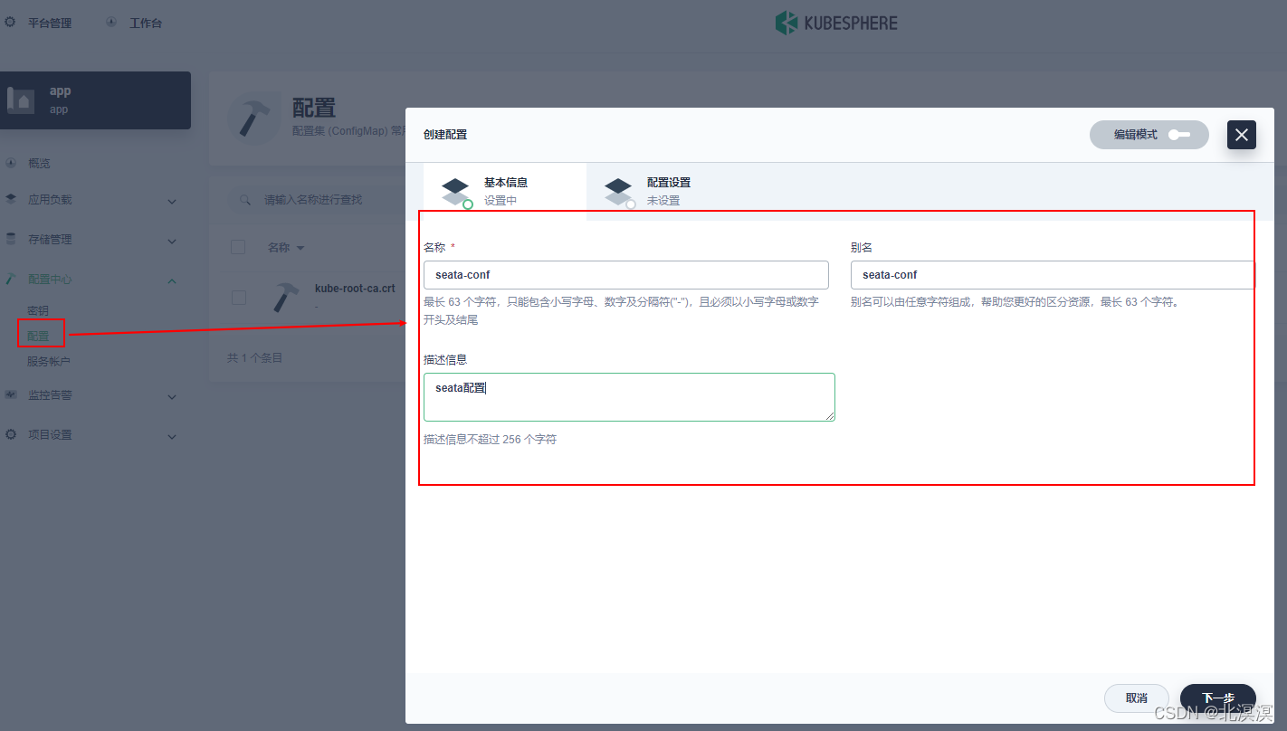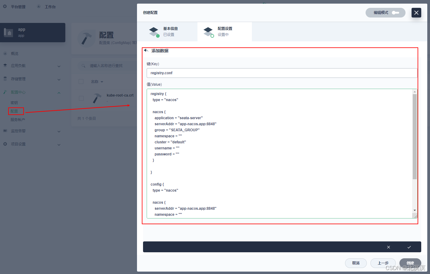 - 点击配置中心->配置->创建,填写seata基本配置信息