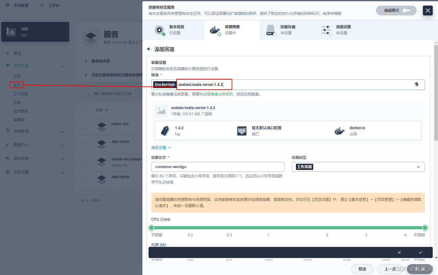 - 选择容器副本数量为3,点击添加容器镜像seataio/seata-server:1.4.2