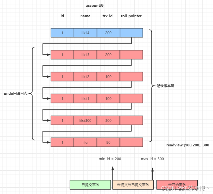 ),这个视图由执行查询时所有未提交事务id数组(数组里最小的id为min_id)和已创建的最大事务id(max_id)组成,事务里的任何sql查询结果