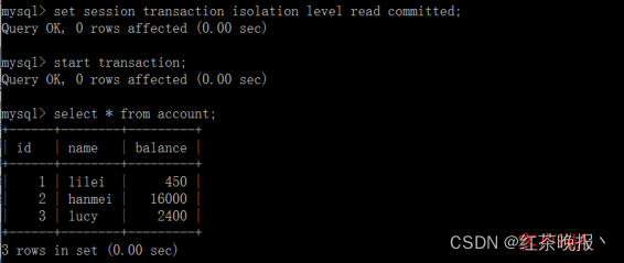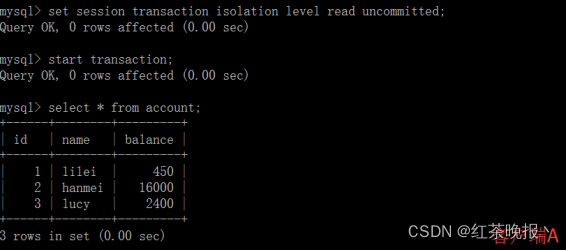 (1)打开一个客户端A,并设置当前事务模式为read committed(未提交读),查询表account的所有记录: