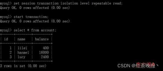 (1)打开一个客户端A,并设置当前事务模式为repeatable read,查询表account的所有记录