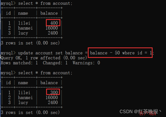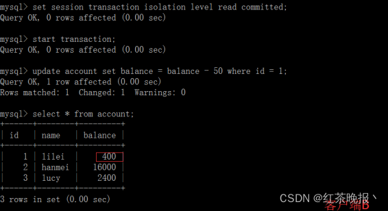 (4)在客户端A,接着执行update account set balance = balance - 50 where id = 1,balance没有变成400-50=350,lilei的balance值用的是步骤2中的350来算的,所以是300,数据的一致性倒是没有被破坏。可重复读的隔离级别下使用了