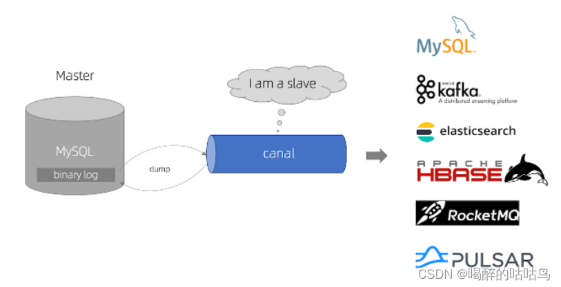 - canal 模拟 MySQL slave 的交互协议,伪装自己为 MySQL slave ,向 MySQL master 发送dump 协议