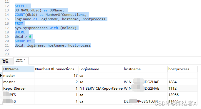 SELECT? DB_NAME(dbid) as DBName,? COUNT(dbid) as NumberOfConnections, loginame as LoginName, hostname, hostprocess FROM sys.sysprocesses with (nolock) WHERE? dbid > 0 GROUP BY? dbid, loginame, hostname, hostprocess