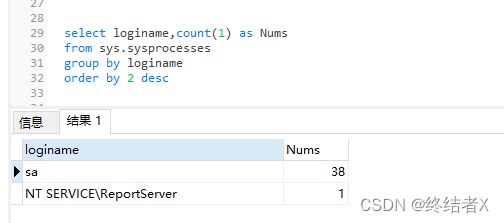 select loginame,count(1) as Nums from sys.sysprocesses group by loginame order by 2 desc