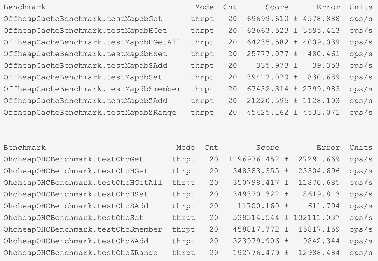 从上面的结果可以看出,ohc性能性能十倍于mapdb。而且由于ohc本身支持entry过期,但是mapdb不支持。