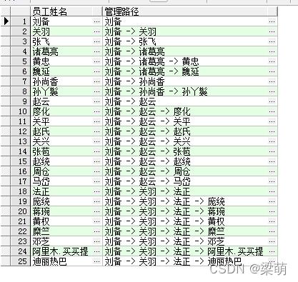 然后第一次执行递归部分,将初始化的结果集(employee_path)与员工表进行连接查询,并找出“刘备”的所有直接下属。