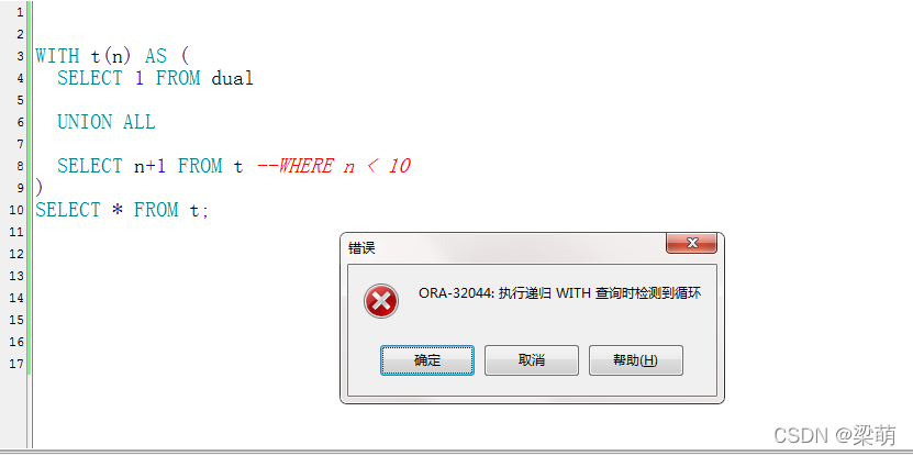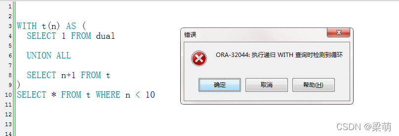 例如,将示例1的WHERE条件去掉,就会报异常,提示递归语句检测到死循环: