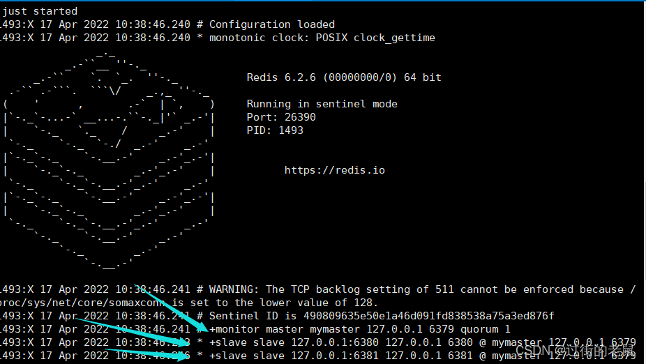 ?此时我们可以看到该哨兵监视到的主机叫 mymaster ,ip为127.0.0.1,端口号为6379,它的从机分别是下面两行,此时启动成功